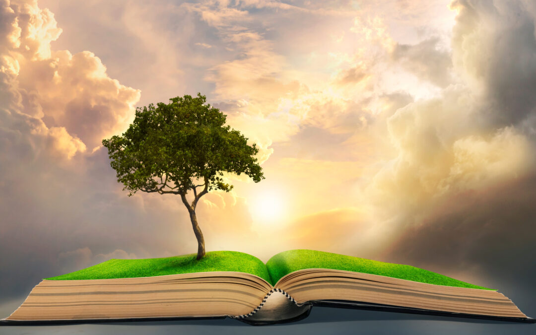 lonely big tree growing up on ancient books like a painting in literature